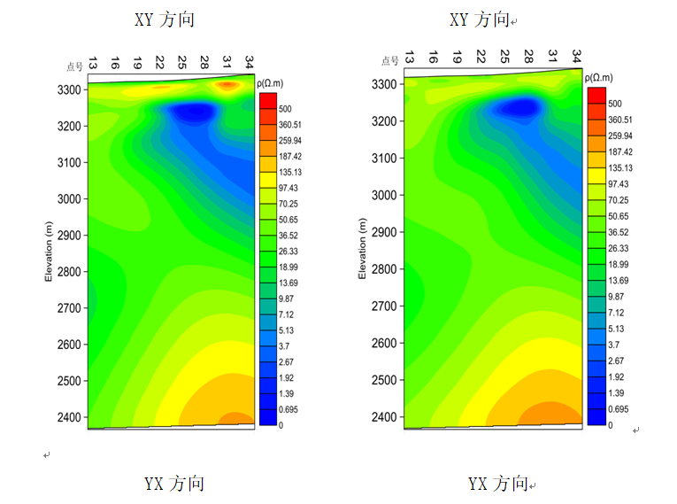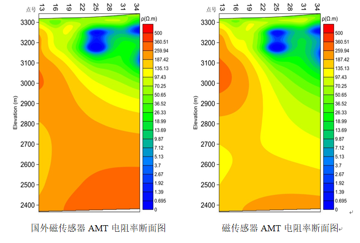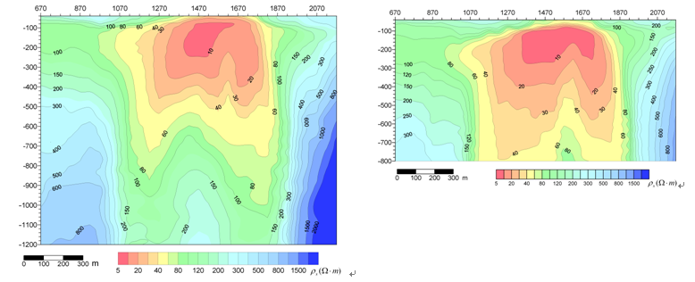 在某礦區使用高溫超導磁強計和使用傳統傳感器測量反演結果對比,左圖是使用高溫超導磁強計的結果,右圖使用傳統傳感器的結果。